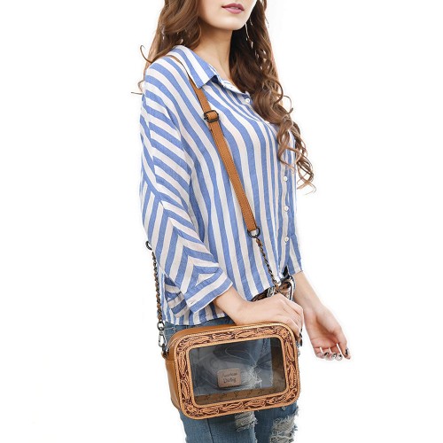 American Darling Clear Crossbody Purse Hand Tooled Tan Leather Trim, Stadium Approved Western Style