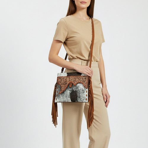 American Darling Hair-On Leather Crossbody Handbag for Women, Western Studded Flap Shoulder Style