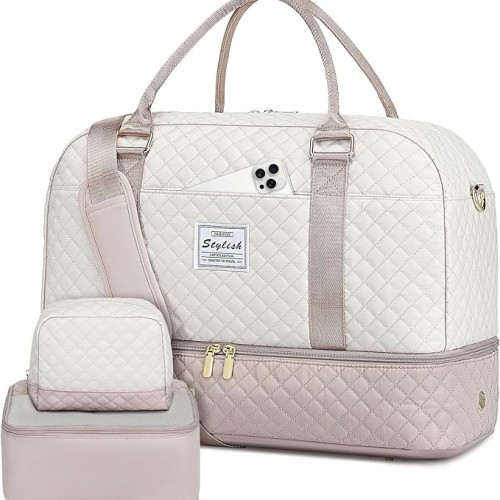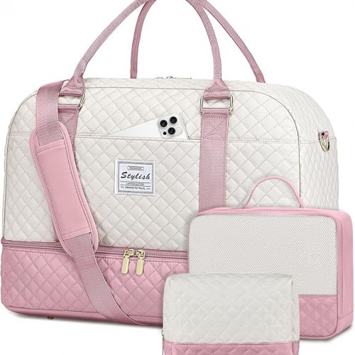 Travel Duffle Weekender Bags for Women: Overnight Bag with Shoe Compartment Carry On Bags with Toiletry & Wet Pocket Large Tote Hospital for Women Labor Delivery Beige Pink