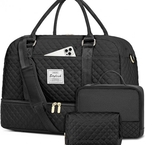 Women Weekender Travel Duffle Bag: Large Overnight Bags with Shoe Compartment Carry on Bags with Toiletry Bag Weekend Yoga Gym Bag with Wet Pocket Travel Duffel Tote Bag Hospital Bag Black
