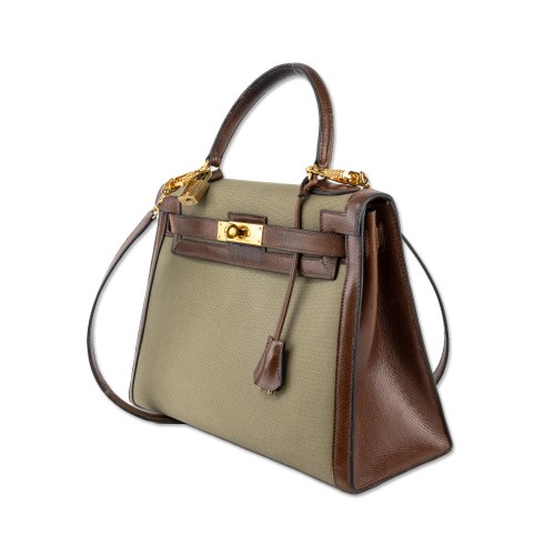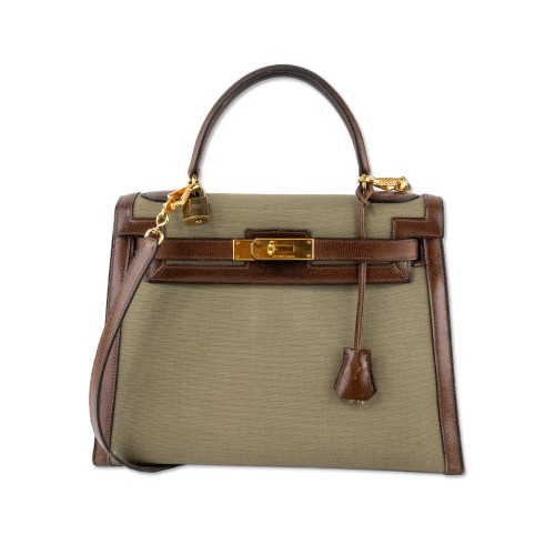 Hermes Vintage Toile Kelly Sellier II 32 in Olive Canvas and Brown Leather