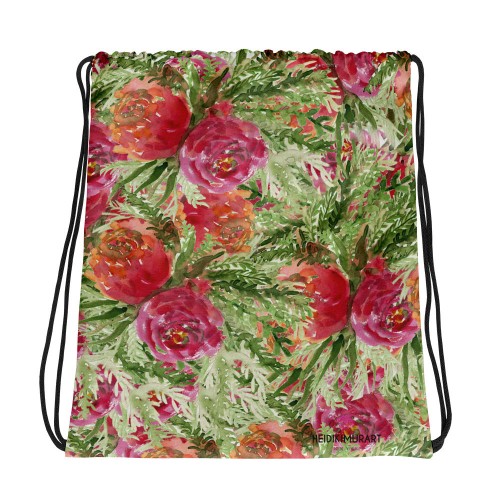Orange Red Rose Drawstring Bag, Floral Print Designer 15”x17” Drawstring Bag – Made in USA/ Europe