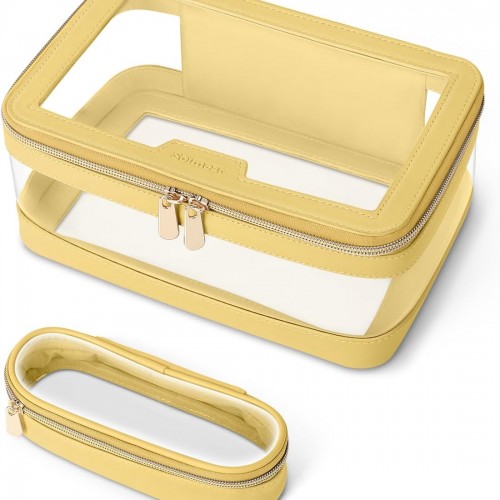 Travel Clear Makeup Bag with Makeup Brush Bag, Leather Makeup Case Toiletry Bag, Portable Cosmetic Bag Case, Transparent Waterproof Cosmetic Organizer Storage Bag for Women, Yellow