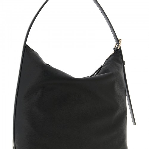 Vera hammered leather shoulder bag with front embossed logo, top zip closure, rigid base, and adjustable handle.