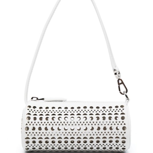 Mini Tube Vienne-pattern leather bag from Alaia featuring light pink, calf leather, tube design, signature Vienne laser-cut motif, silver-tone hardware, single top handle, top zip fastening and main compartment.