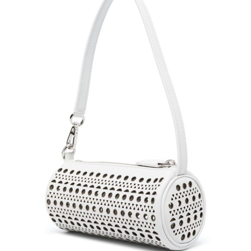 Mini Tube Vienne-pattern leather bag from Alaia featuring optical white, calf leather, tube design, signature Vienne laser-cut motif, silver-tone hardware, single top handle, top zip fastening and main compartment.