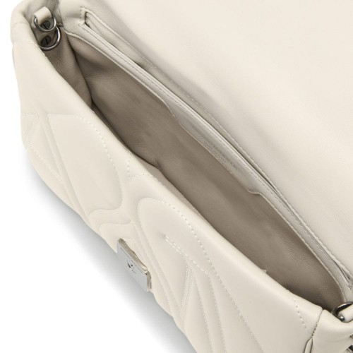 small The Seal shoulder bag from Alexander McQueen featuring ivory white, calf leather, quilted, silver-tone logo plaque, detachable chain-link shoulder strap, detachable adjustable leather and chain-link waist strap, foldover top with magnetic fastening, main compartment and internal pocket.
