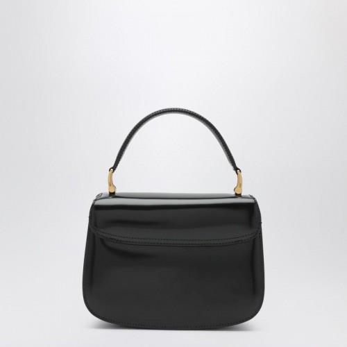 Ami Paris black leather bag featuring a removable and adjustable shoulder strap, top handle, magnetic flap closure, gold-tone Ami De Coeur metal plaque on the front, suede lining, one central compartment with a patch pocket and one front compartment.