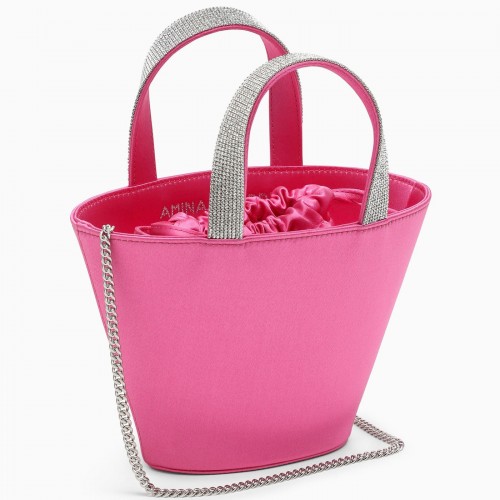 Pink satin bucket bag by Amina Muaddi featuring a crystal logo on the inside, two handles with all-over crystals and a removable chain shoulder strap.