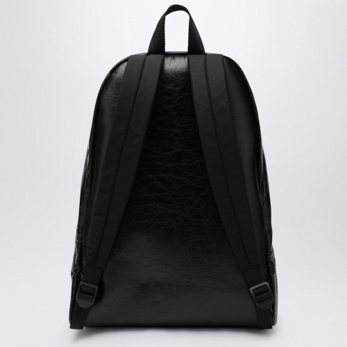 Black Arena lambskin backpack by Balenciaga, featuring colourful printed stickers all over, top handle, adjustable shoulder straps, embossed and printed logo lettering on the front, top zip closure with double slider, one front zip pocket, one internal zip pocket, one internal patch pocket, zipper pull with engraved BB logo and cotton cord, and cotton canvas lining.