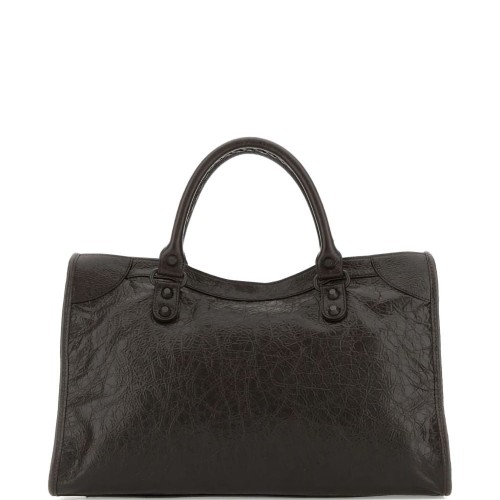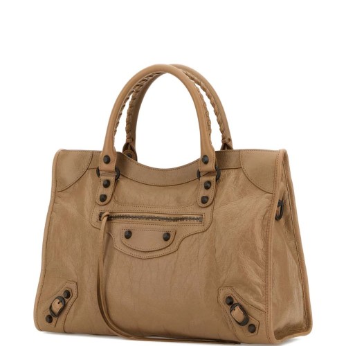Soft, supple leather bag features iconic brass hardware, including zipper pulls, studs, and the signature front zipper pocket.