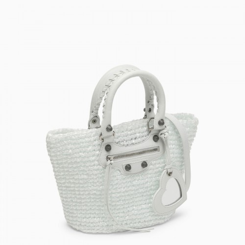 Small bucket bag by Balenciaga made of transparent woven nylon with a white raffia effect, featuring two top handles, a front zip pocket, a removable heart mirror with tone-on-tone logo and antiqued silver hardware.
