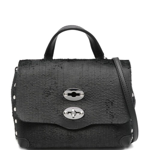 Arena Storico metallic lambskin clutch Le City bag, top zip closure, shiny silver stud details, front zip pocket, removable handle, adjustable and removable shoulder strap, cotton canvas lining.