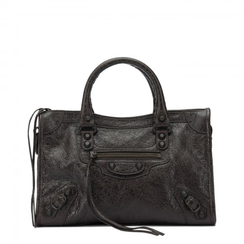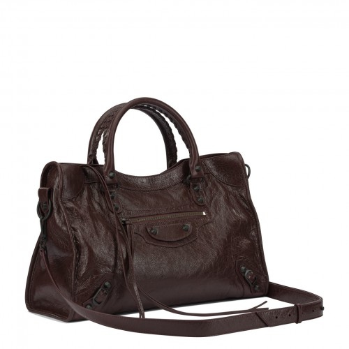 Balenciaga “Le City” handbag, constructed of Arena Storico lambskin leather with a visible grained surface. The flexible structure features two hand-woven leather handles and an adjustable, removable shoulder strap. The silhouette features a top closure with a zipper and knotted leather pull, functional details evident on the main body and front zippered pocket. The interior includes a cotton canvas lining.