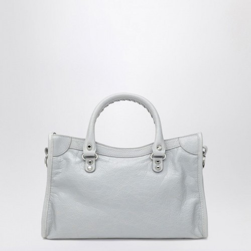 Small tote bag by Balenciaga in light grey Arena Storico lambskin leather, featuring two top handles, an adjustable and removable shoulder strap, a zip fastening, a leather zip puller, a front zip pocket and an interior zip pocket.