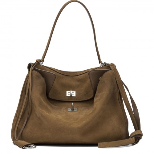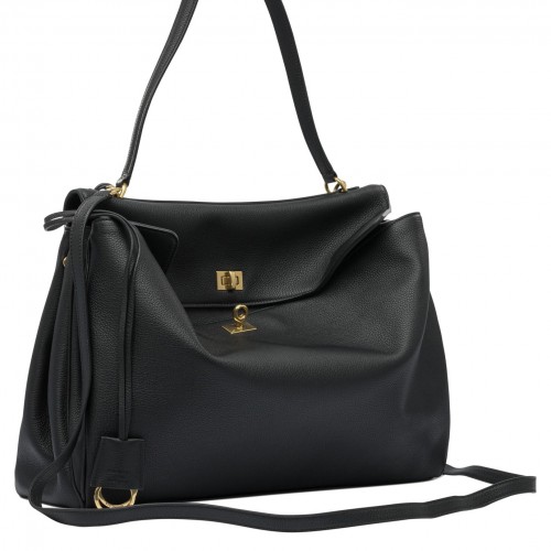 Balenciaga “Rodeo” shoulder bag with grained calfskin construction, featuring a rigid structure with a single top handle and removable shoulder strap. It features a defined compact silhouette enhanced by functional details such as a swivel padlock closure and a removable cloche clés with two split rings. Antiqued gold hardware complements the minimalist, geometric construction.