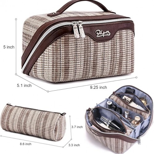 BOYATU Travel Makeup Bag for Women: Large Capacity Open Flat Make up Bag Set of 3 – Vegan Leather Cosmetic Bag with Compartments – Waterproof Toiletry Bag with Handle & Divider(I-5-Brown)