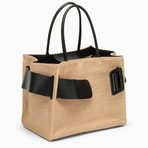 Big bag in beige and black raffia by BOYY, featuring a maxi buckle on the front, two top handles, an inside flat pocket with zip and hook fastening.
