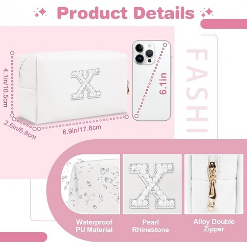 Bride Gifts – Personalized Initial Makeup Bag with Pearl Rhinestone Patch, Preppy White Monogram Cosmetic/Toiletry Pouch, bridesmaid Gifts, Bridal Shower Gifts, Wedding Gifts, Bridal Gifts,X