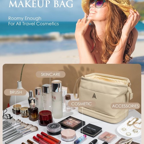 Bridesmaid Gift, Initial Makeup Bags, Personalized Double Layer Cosmetic Bag with Makeup Brush Organizer, Waterproof, Large Capacity PU Leather Travel Toiletry Bag