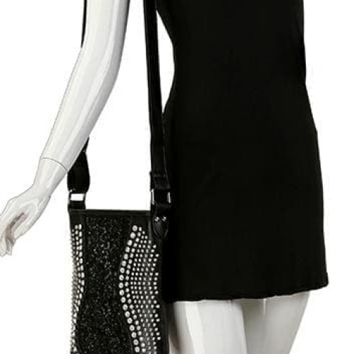 Tiny crystals and studded stones add shimmering glamour to a practical crossbody sling with a lace insert.