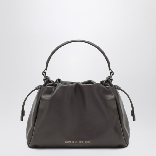 Brunello Cucinelli small ivory soft-leather bag with drawstring closure featuring monile detail, adjustable and removable shoulder strap, top handle, leather lining, internal zip pocket, and front logo lettering.