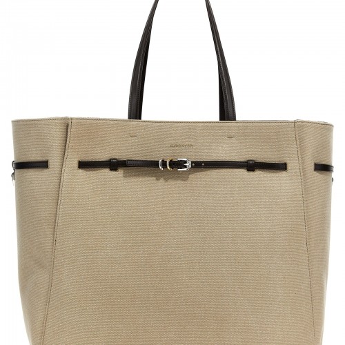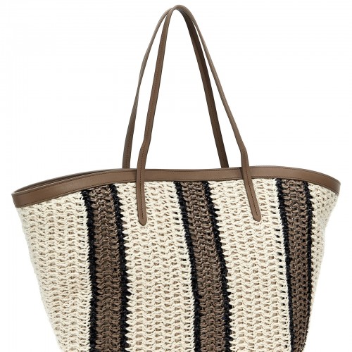 Striped woven jute blend shopping bag, double leather handle, lined interior with zipped pocket.