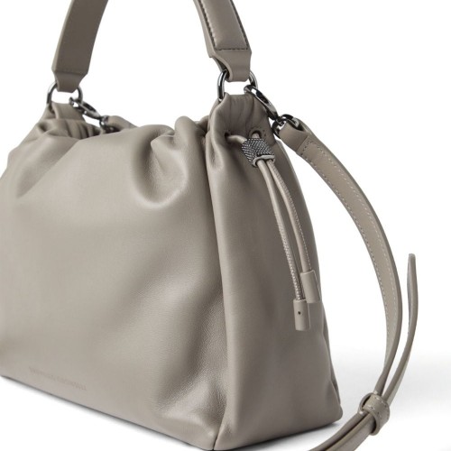 light grey calf leather top drawstring fastening adjustable detachable shoulder strap signature Monili chain detail internal zip-fastening pocket embossed logo to the front single top handle