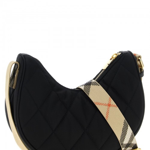 ‘Horseshoe’ quilted nylon blend crossbody bag, leather logo patch with metal ‘Equestrian Knight Design’, adjustable Burberry Check print fabric shoulder strap, top zip closure.