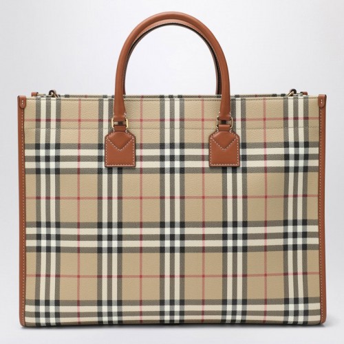 Medium-sized Burberry Tote bag in beige coated cotton blend with Check pattern, featuring leather finishes, cotton interior, a front pocket with flap and buttons, two rounded top handles, removable and adjustable shoulder strap, an internal zip pocket, an internal slip pocket, snap button closure, and a luggage tag with logo lettering.