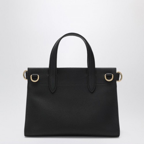 Burberry mini tote bag in black grained leather featuring adjustable and detachable shoulder strap, top handles, Check-engraved closure with metal D-ring, adjustable side tabs, internal zip pocket, hand-painted edges, brushed metal hardware, embossed logo on the front and Burberry Check interior.
