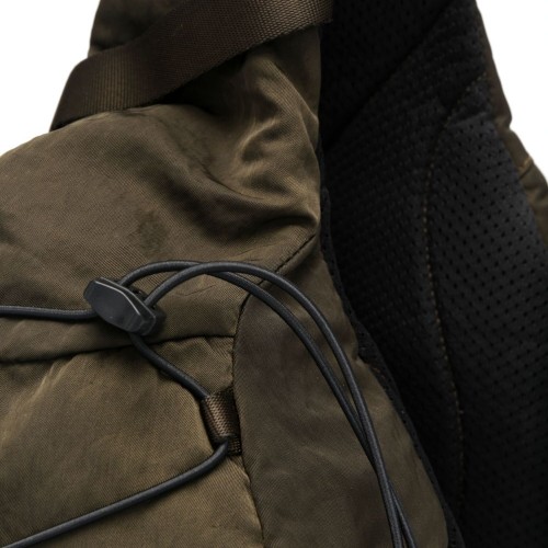 dark green water-resistant garment dyed signature Lens detail adjustable shoulder straps buckle fastening side zip fastening side zip-fastening pocket bungee lacing system main compartment internal logo patch internal mesh pocket breathable mesh back authenticity QR code