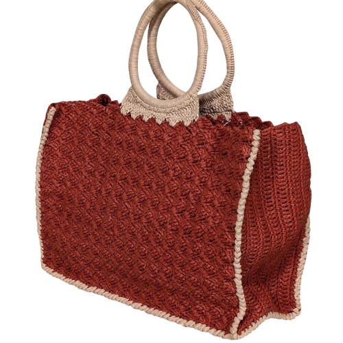 Designed for fashion-forward individuals, this rust orange and beige raffia “O” ring handbag from Carrie Forbes is the perfect accessory for any occasion. From fairs and festivals to vacation outings, this bag adds a unique touch to any outfit. Pair it with a linen sleeveless dress and slide sandals for a stylish and effortless look.