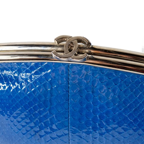 Chanel timeless clutch construction with silver tone frame in a cobalt blue glazed python. Silver tone CC snap closure at top.