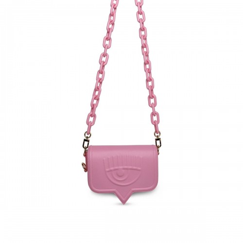 Made of raffia with contrasting details, two removable chain shoulder straps, flap with magnetic closure and front logo, inside zip pocket, logo on the back 18 x 15 x 5 cm