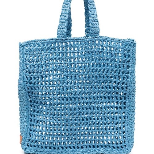 Naxos woven raffia tote bag from Chica featuring cognac brown, raffia, interwoven design, two flat top handles, square shape, open top, main compartment and no lining.