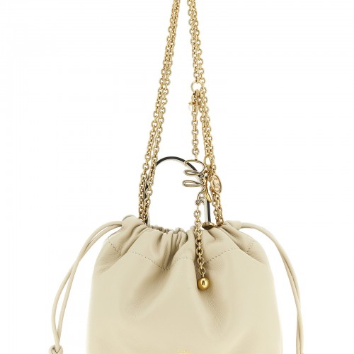 ‘Chloé Icons’ mini shoulder bag in smooth lamb nappa leather, front embossed logo, drawstring closure, fixed handle, ‘Gold’ chain shoulder strap with ‘Horse Medal’ details and charms.