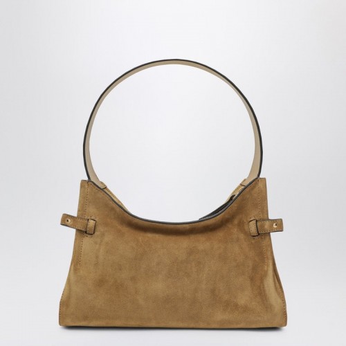 Chloé hobo bag in khaki suede calfskin leather, characterized by a leather handle, double chain with dangling charms and the letters Chloé, zip closure, one main compartment, and a flat internal pocket for cards.