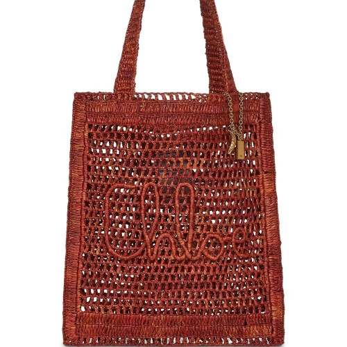 Large Chloé tote bag in gray suede calfskin, featuring hanging chain with logo medallions, magnetic closure, two top handles with gold-finish metal rings, main compartment, and gold-tone metal hardware.