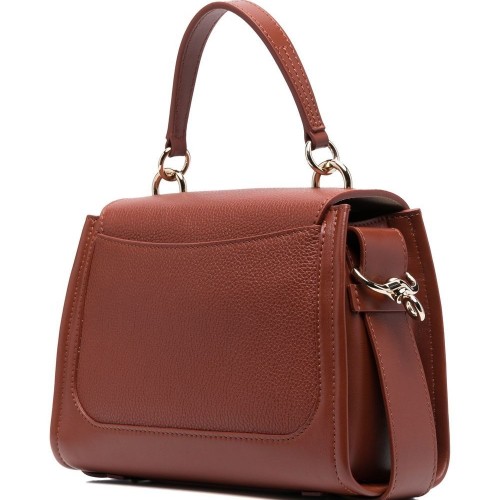 brown calf leather grained texture adjustable shoulder strap single top handle foldover top main compartment internal zip-fastening pocket gold-tone hardware