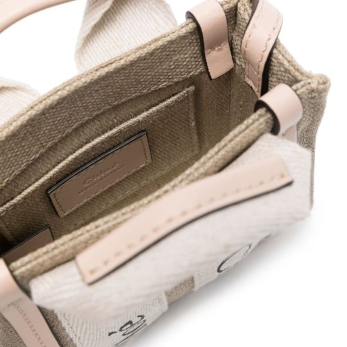 ecru/cream white/light pink linen/flax leather trim colour-block panelled design logo-print straps two rolled top handles thin shoulder strap main compartment internal patch pocket linen lining no fastening This item contains at least 50% materials which are certified or widely recognised as having a lower environmental impact through production and/or manufacturing processes that reduce water consumption and the use of harmful chemicals, or re-use by-products of the production process. Learn more about what makes a product Conscious on our Conscious Criteria page