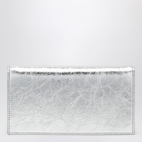 Silver laminated leather clutch by Christian Louboutin featuring a flap closure with magnetic button, CL monogram on the front, a removable shoulder strap and a single compartment with several internal card slots.