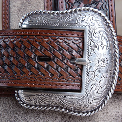 The belt strap is expertly scalloped along the edges, creating a dynamic shape that draws attention to the detailing. Adding a bold flair, the belt is embellished with antique silver-tone spacers that feature a gold-tone star concho in the center. The entire design is finished with crisp single-row contrast stitching (white/cream). It comes complete with a stunning, removable antique silver-tone buckle featuring classic Western scrollwork, ready for customization.