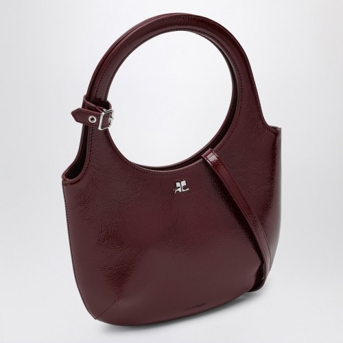 Bordeaux Naplak leather Courrèges bag featuring a snap button closure, two top handles with strap detail, metal logo on the front, an adjustable and removable shoulder strap and an interior flat pocket.