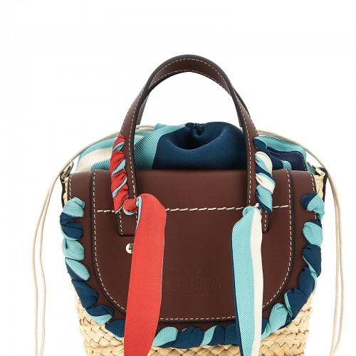 Cuba Lab x SanPa ‘Habanera Silk- Orangerie’ raffia and leather handbag with silk details, double handle, Orangerie print silk lining with drawstring closure, adjustable and removable fabric shoulder strap.