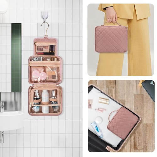 CUBETASTIC Travel Toiletry Bag, Makeup Bag for Women, Small Hanging Travel Bag for Toiletries with 3 Compartment, Portable Cosmetic Organizer Case, Water-resistant, Pink