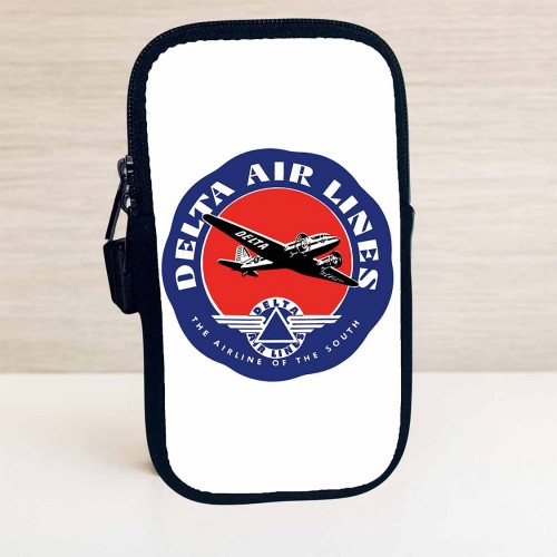 This water resistant travel pouch has the image of a vintage 1930’s bag sticker used by Delta Air Lines. The flip side is black.