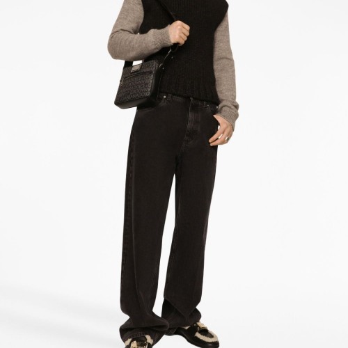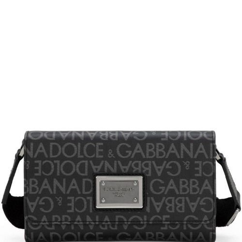logo-print jacquard zipped shoulder bag from DOLCE & GABBANA featuring charcoal grey, cotton blend, full jacquard, all-over logo print, silver-tone logo plaque, internal logo plaque, silver-tone hardware, top zip fastening, adjustable shoulder strap, front zip-fastening pocket and main compartment.