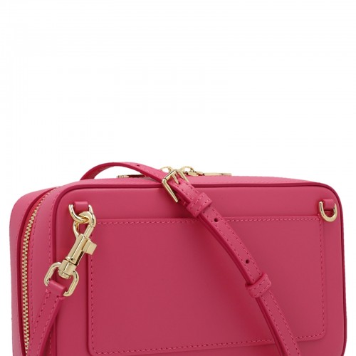 Leather crossbody bag with front logo, zip closure, and adjustable and removable shoulder strap.