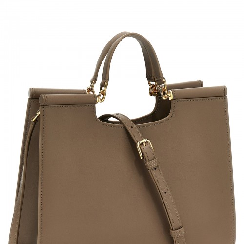 Small ‘Sicily’ leather shopping bag, double fixed handle, front embossed logo, gold metal details, adjustable and removable shoulder strap.